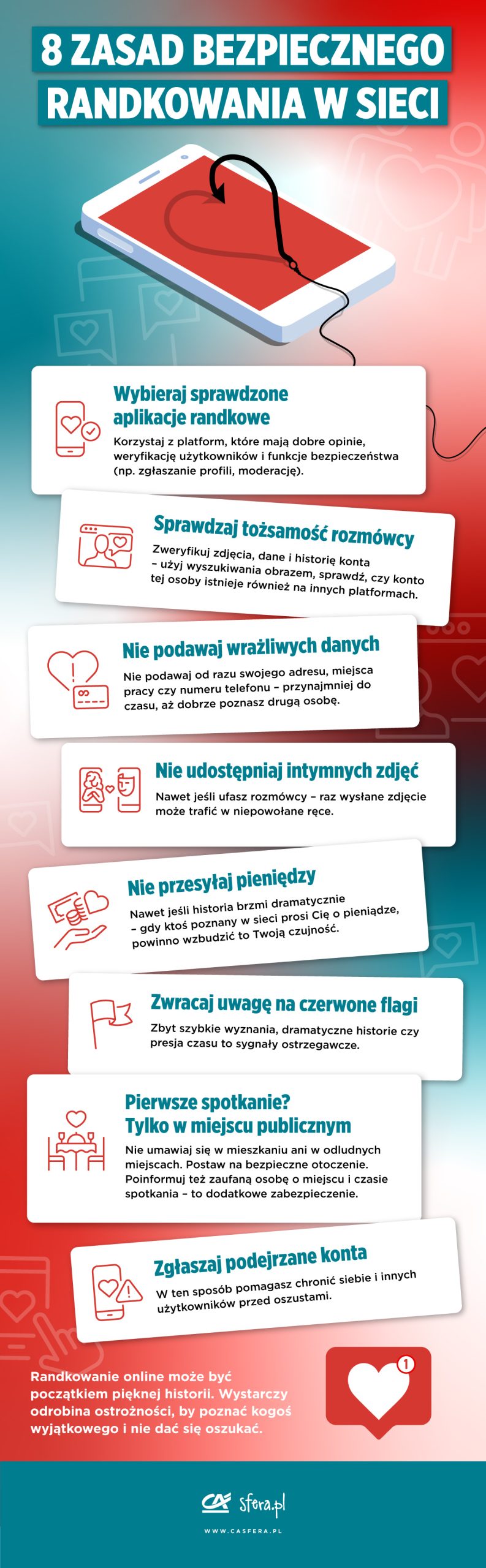 Znajomość czerwonych flag i możliwych zagrożeń to jedno. Drugim krokiem jest aktywne zabezpieczanie siebie, swoich danych i prywatności. Nawet jeśli znajomość rozwija się w obiecującym kierunku, warto zachować czujność. Oto praktyczne rady, które mogą ochronić Cię przed kosztownym błędem: