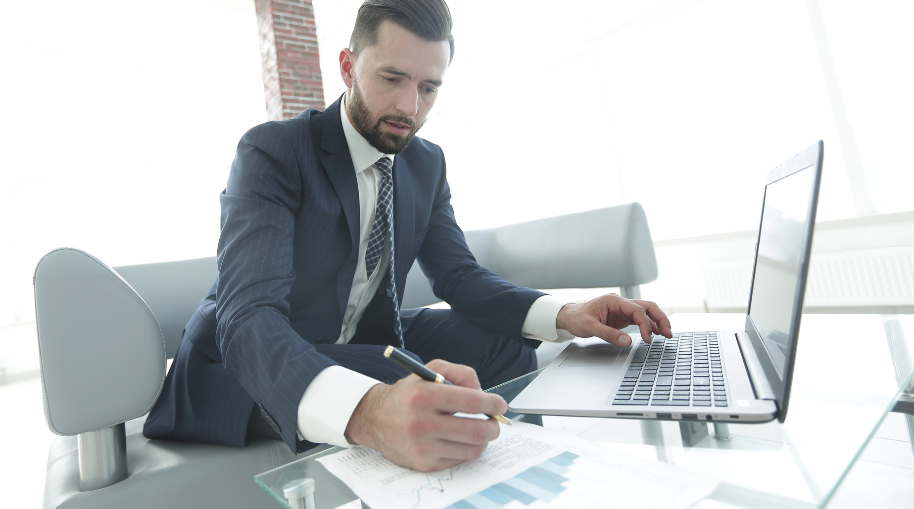 Businessman working with business graphics on a laptop computer. Photo has a copy of space